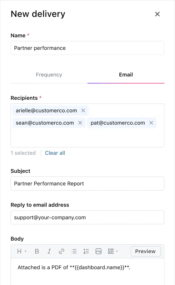 Share workbooks or dashboards with URLs that maintain all your query parameters or schedule them to be sent via email. If you want to share data outside of your organization, check out our embedded analytics.