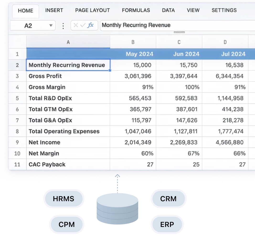 Bring data from your ERP, HRMS, CRM, and more into your data warehouse. Model financials, pipeline, headcount, and more from a single connected source of truth.