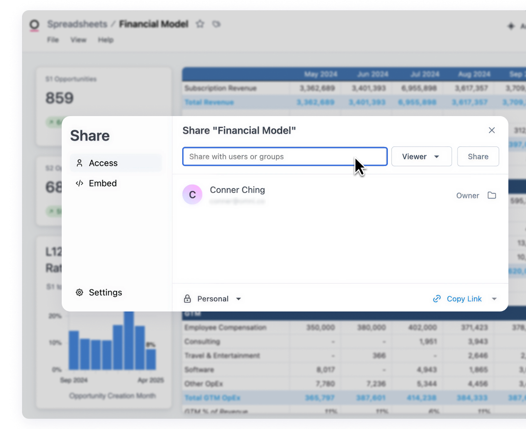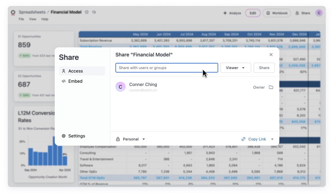 Stop emailing “Forecast_v9_final.xlsx.” Stakeholders open a live workbook with built-in permissions and version history, so everyone stays in sync.